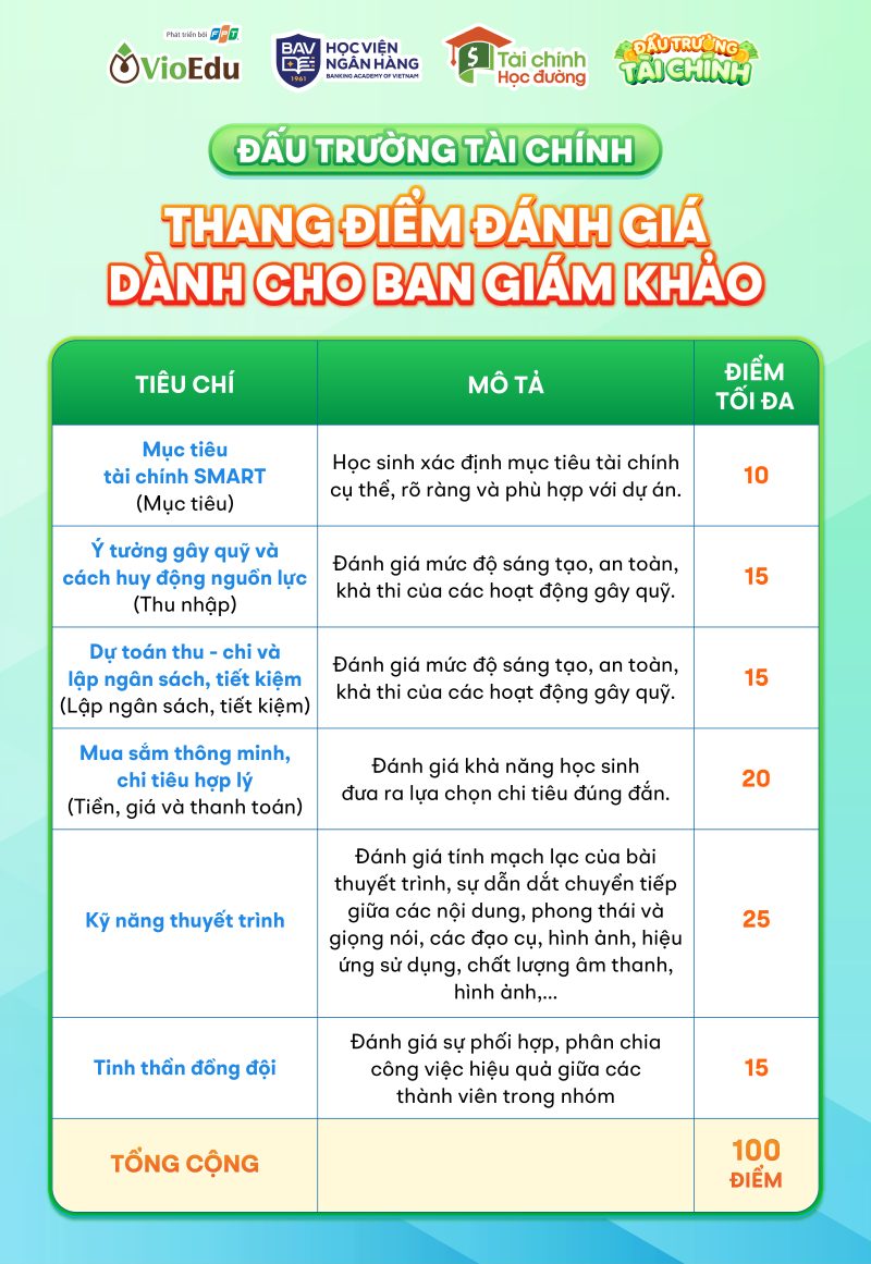 Thang điểm tính điểm bình chọn: Các bài dự thi hợp lệ sẽ được BTC upload lên fanpage: Vòng Khởi nghiệp Đấu trường Tài chính VioEdu. Tổng điểm tương tác hợp lệ của mỗi bài sẽ được quy đổi thành điểm bình chọn và xếp hạng trong nhóm giữa 100 đội.