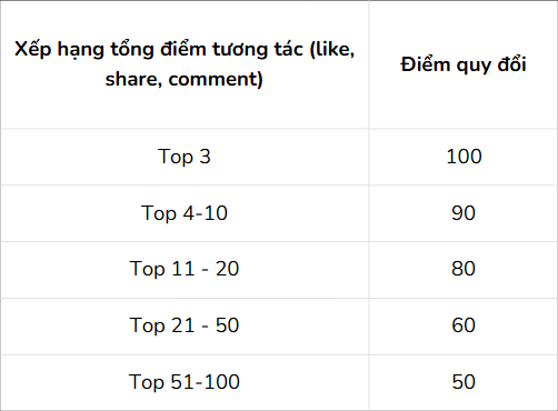 Bảng quy đổi điểm tương tác thành điểm bình chọn: