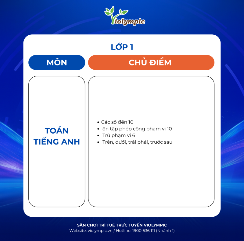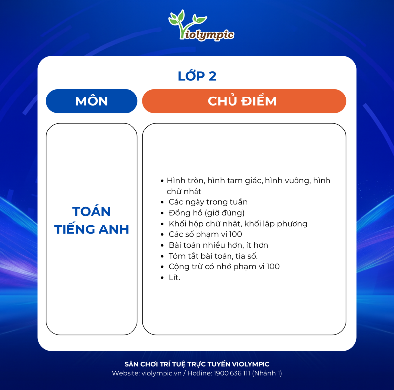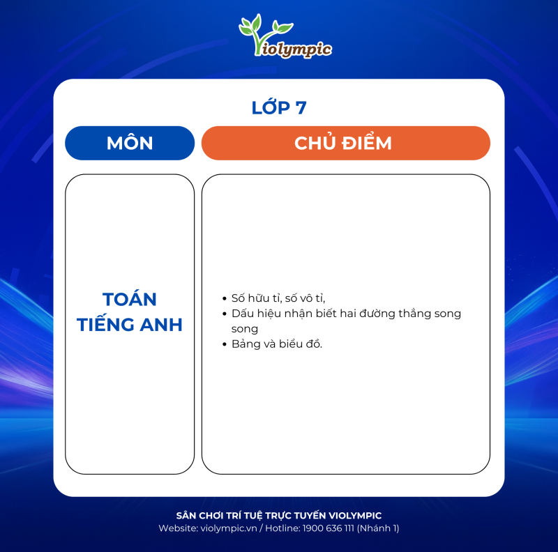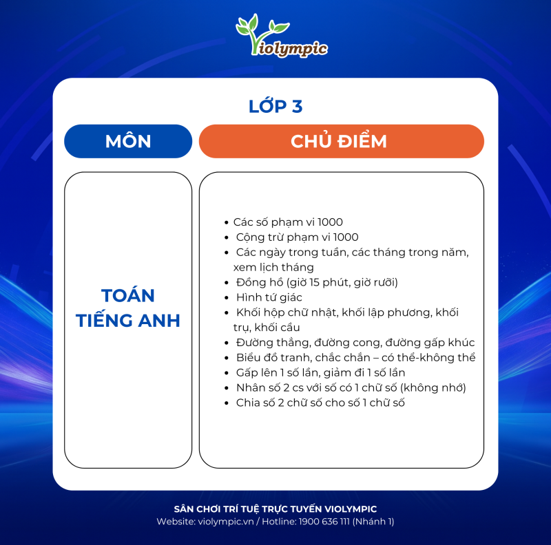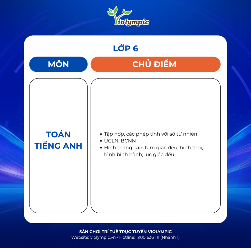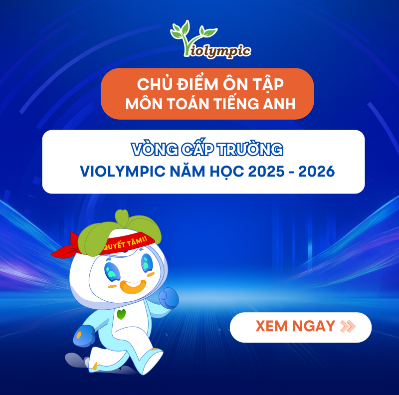 BTC Violympic Quốc gia gửi tới các em học sinh các chủ điểm ôn tập môn Toán Tiếng Anh vòng thi cấp Trường năm học 2025 – 2026.