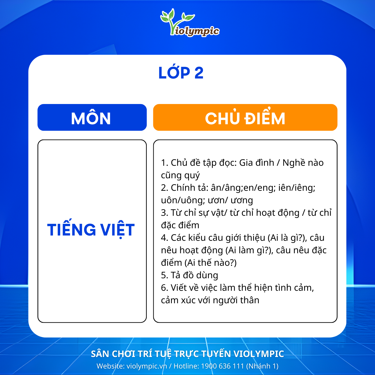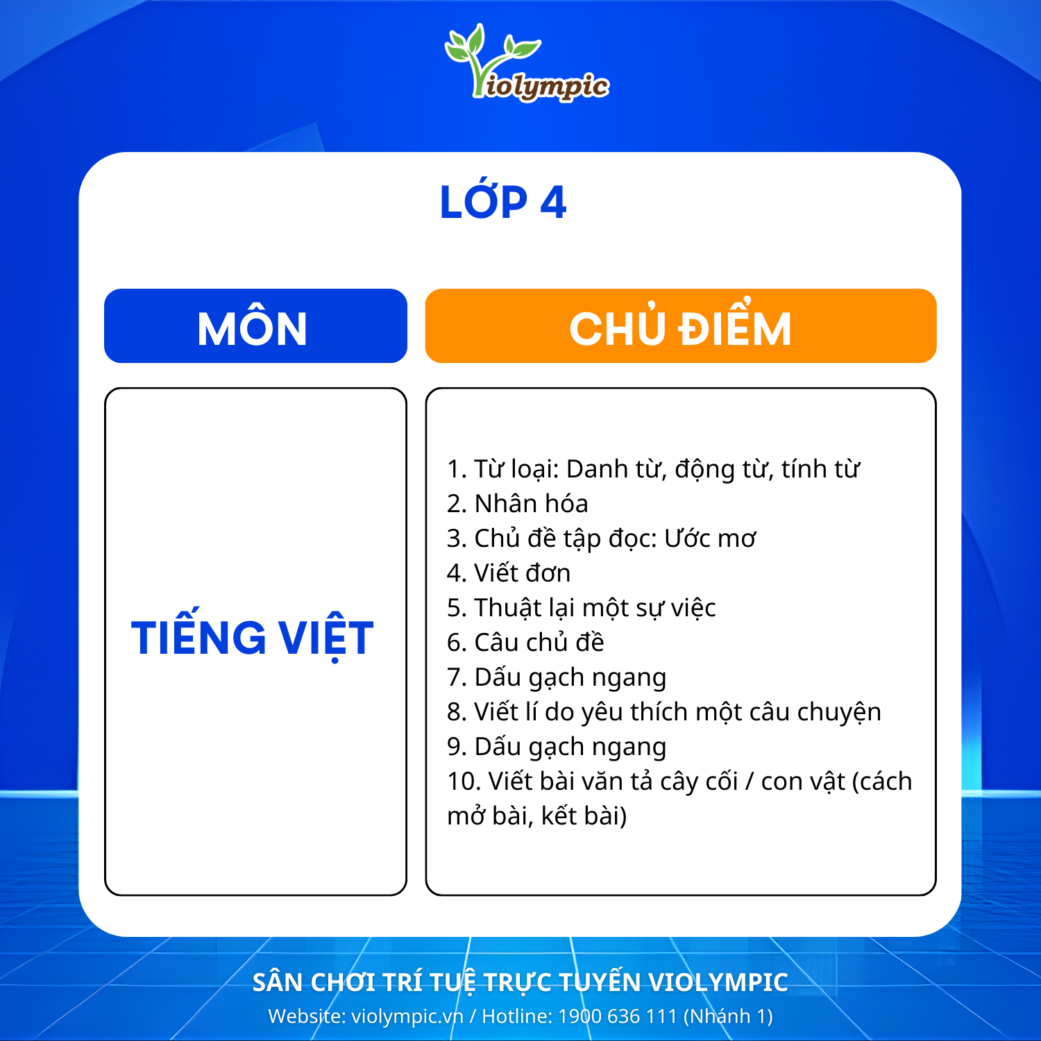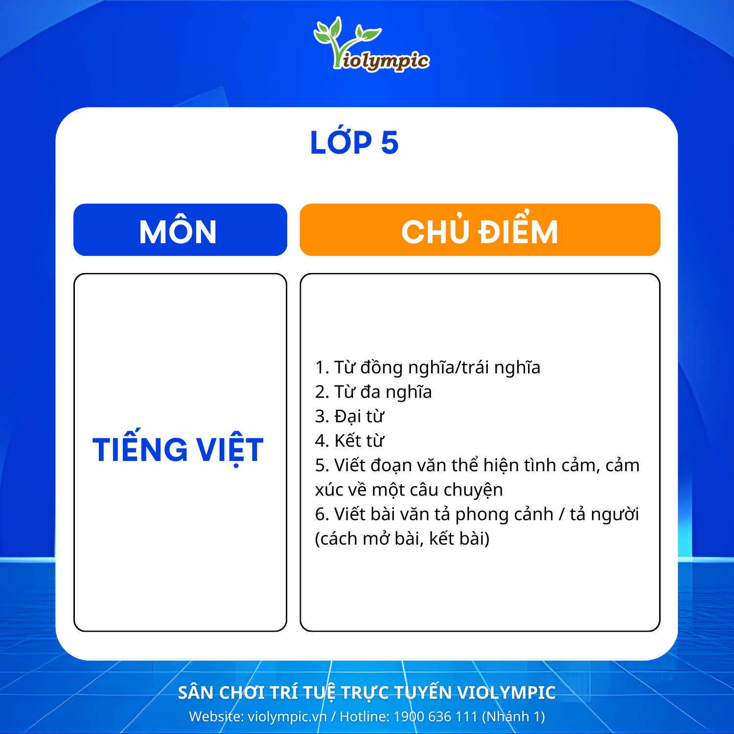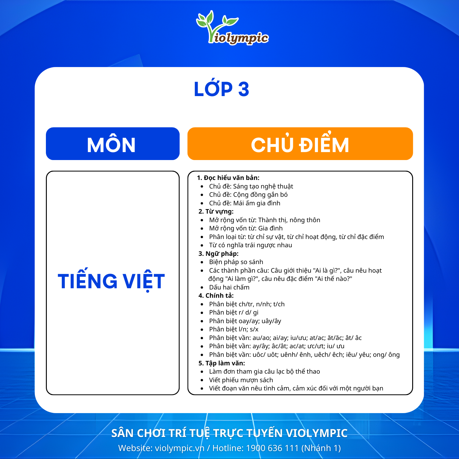 BTC Violympic Quốc gia gửi tới các em học sinh các chủ điểm ôn tập môn Tiếng Việt vòng thi Cụm Trường năm học 2025 – 2026.