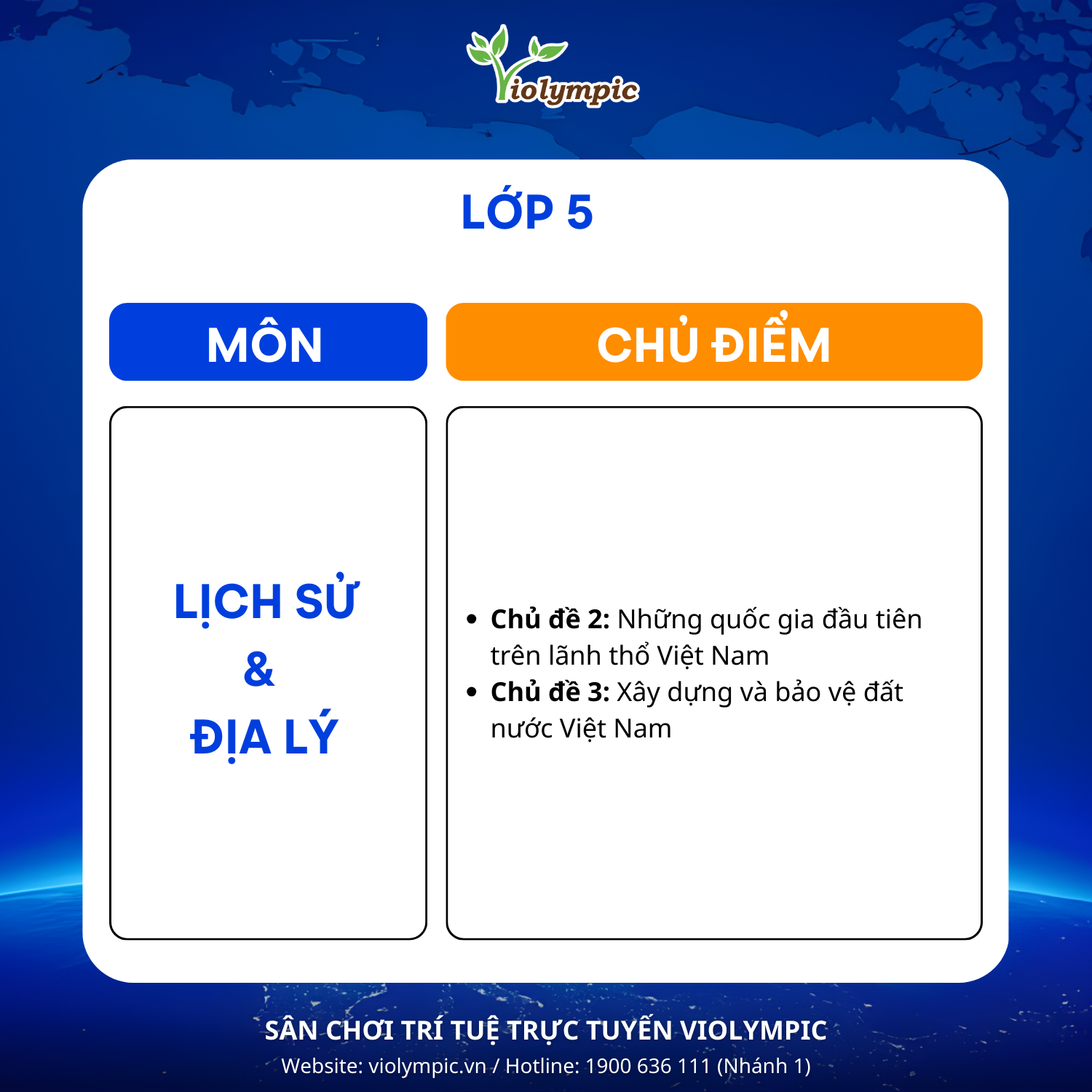 BTC Violympic Quốc gia gửi tới các em học sinh các chủ điểm ôn tập môn Lịch sử & Địa lý vòng thi Tỉnh/Thành phố năm học 2025 – 2026.