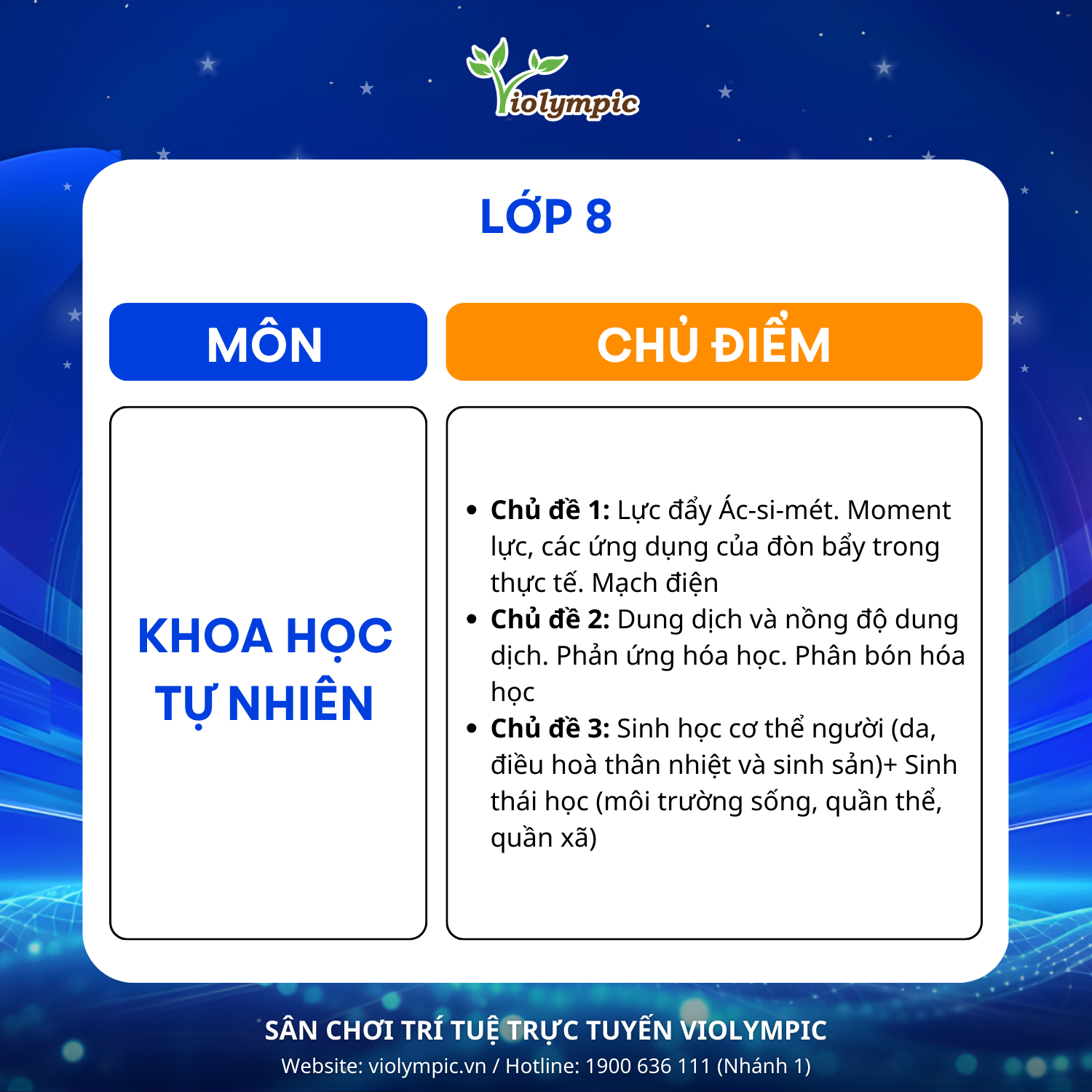 BTC Violympic Quốc gia gửi tới các em học sinh các chủ điểm ôn tập môn Khoa học Tự nhiên vòng thi Quốc gia năm học 2025 – 2026.