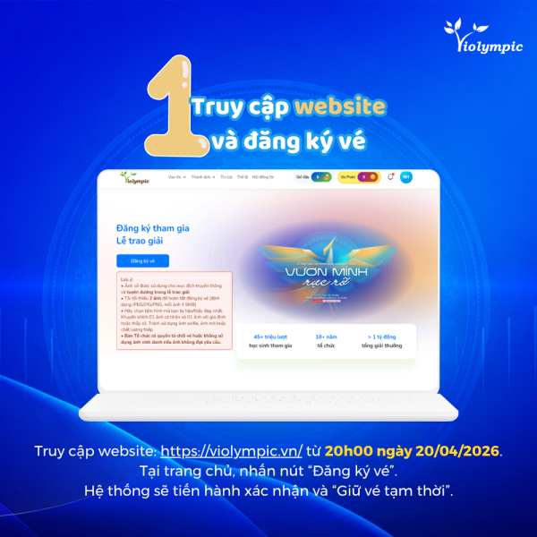 BTC xin thông báo chi tiết cách thức đăng ký vé tham dự Lễ trao giải Violympic 2025-2026. Để hoàn tất đăng ký vé tham dự một cách trọn vẹn nhất, quý phụ huynh và học sinh vui lòng thực hiện đầy đủ các bước sau: